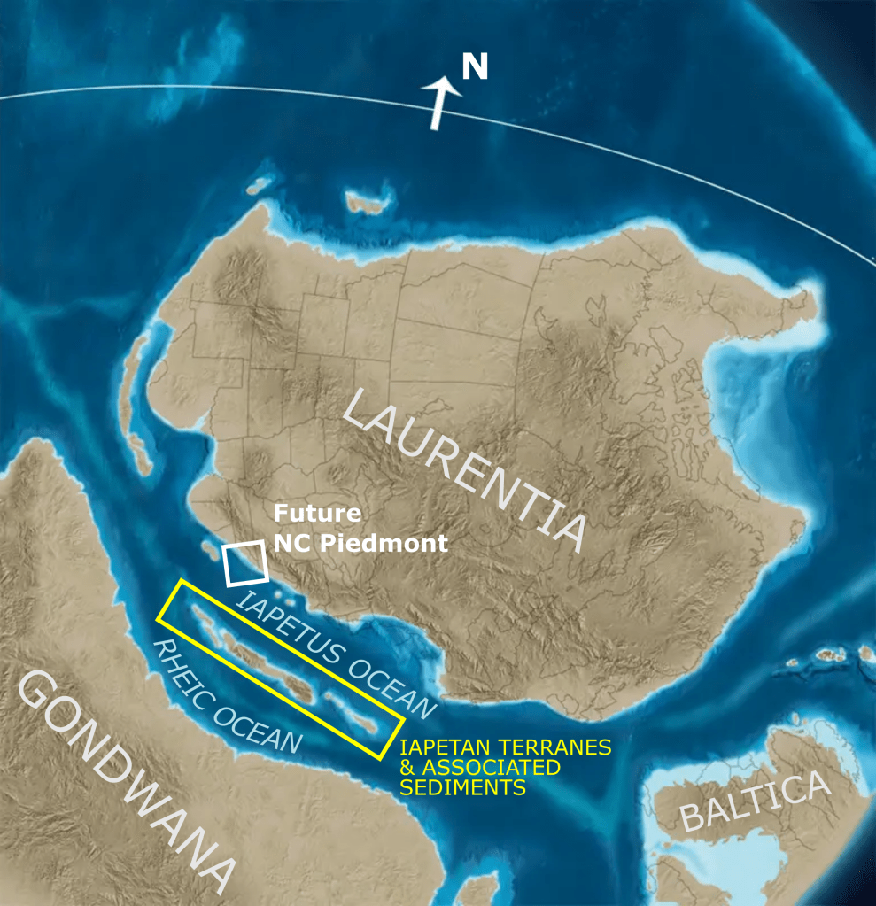 The second region is right here in North Carolina, where the Piedmont contains metamorphosed sediments associated with the Carolina Terrane. These sediments, deposited on the flanks of an offshore volcanic arc, are a record of conditions in the Iapetus Ocean immediately prior to the Cambrian Explosion.